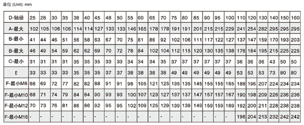 A-蓋直徑 B-填料腔內(nèi)徑直 C-軸或軸套直徑 E-填料腔外側(cè)密封長度 F-相應(yīng)于不同螺栓規(guī)格的最小螺栓中心距
